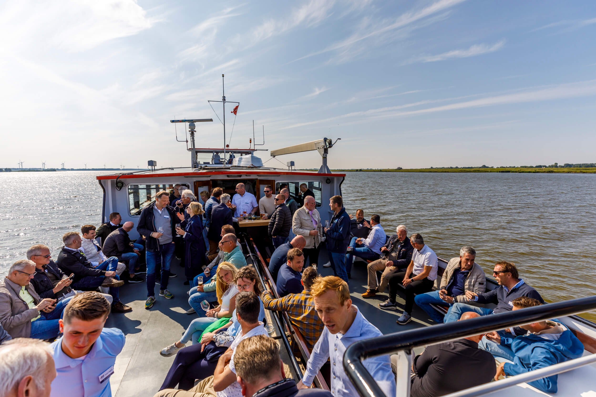 Na de lunch vertrokken we gezamenlijk met een boot naar het bijzondere eiland Tiengemeten, een plek die perfect aansloot bij de exclusieve sfeer van onze jubileumdag. Tijdens de boottocht inspireerde Jasper Engel, expert in nieuwe mobiliteit, de groep met een boeiende presentatie over de toekomst van de automotive branche. Hij belichtte onderwerpen zoals elektrificatie, waterstoftechnologie en de veranderende bestelwagenmarkt. Dit leverde nieuwe inzichten op en leidde tot interessante gesprekken.