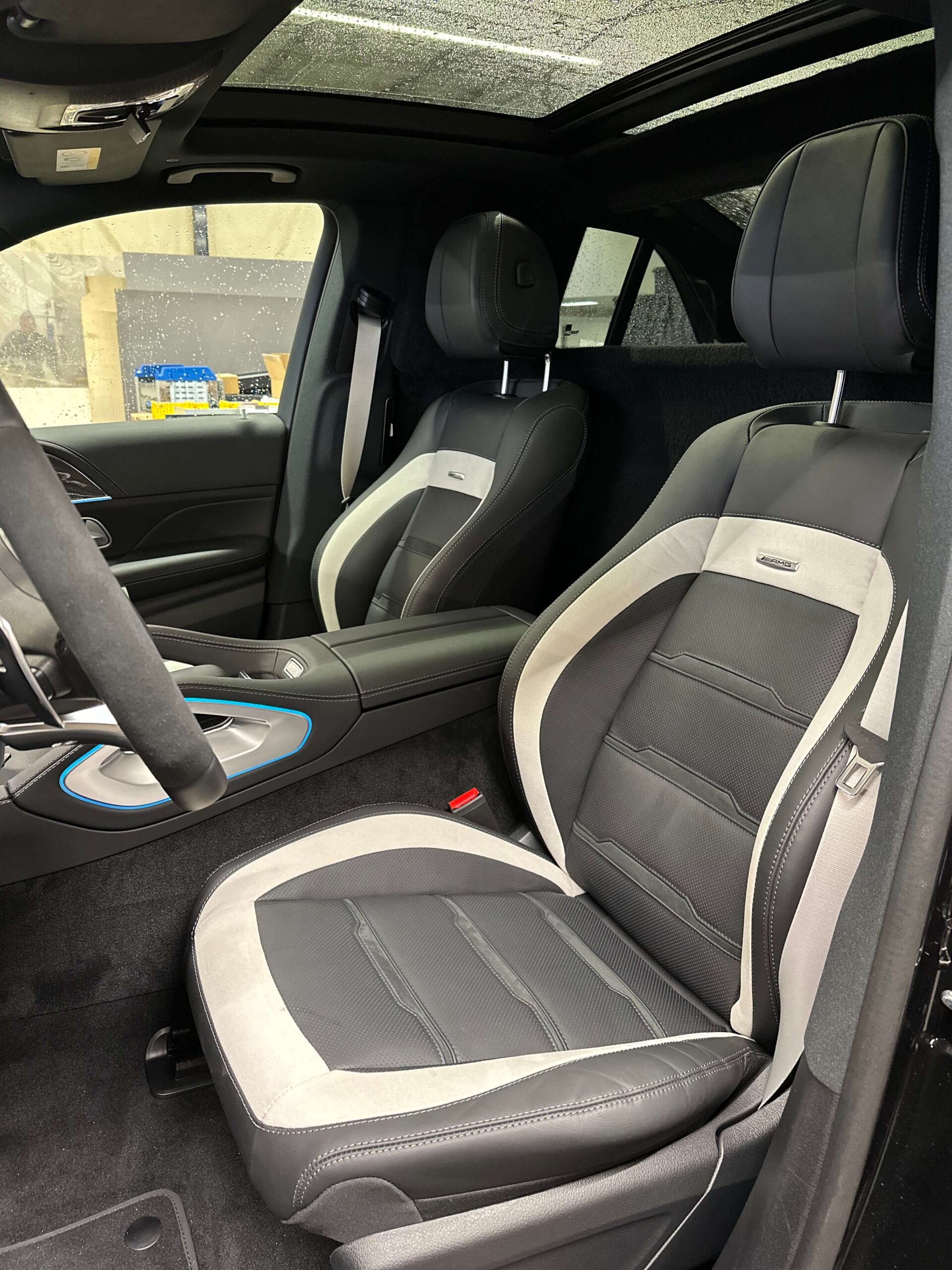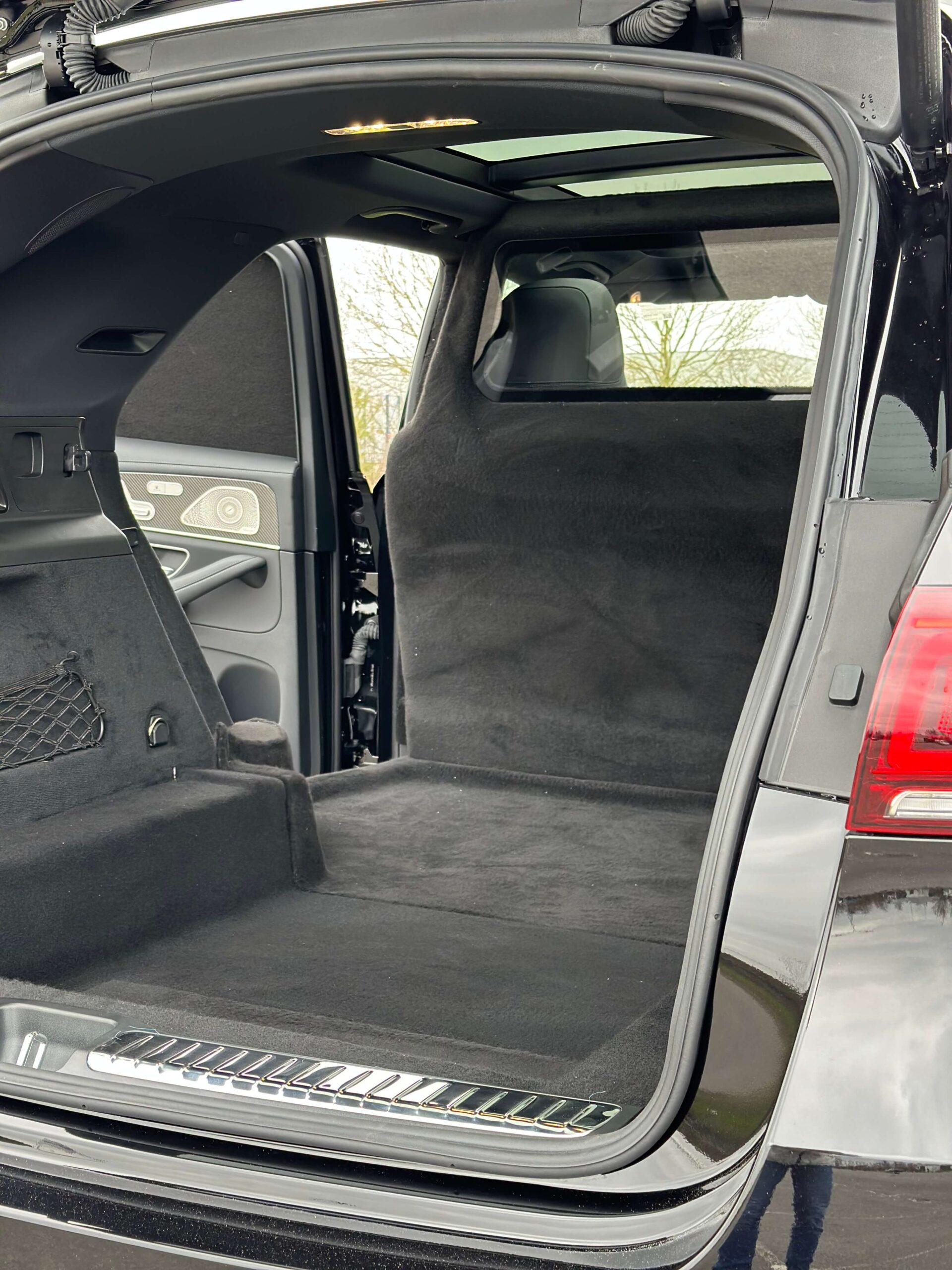 Om de GLE geschikt te maken als grijs kenteken voertuig, hebben we een vaste tussenwand geplaatst op de B-stijl. Deze tussenwand scheidt de cabine van de laadruimte en voldoet aan de actuele regelgeving. De achterbank is verwijderd om plaats te maken voor een volledig vlakke laadvloer, wat de laadruimte praktisch en efficiënt maakt voor dagelijks gebruik.