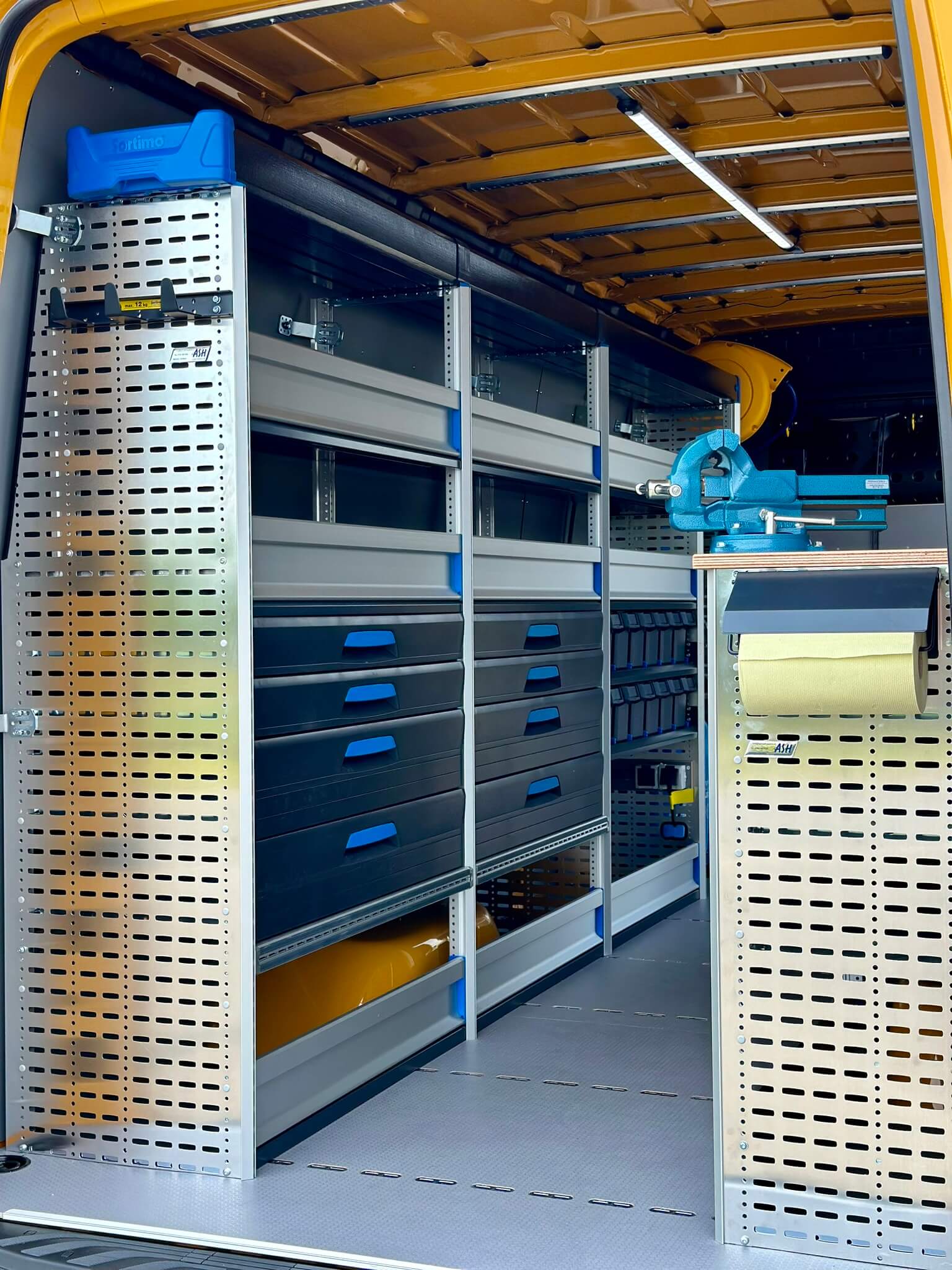 De rechterzijde bevat een compacter systeem met schuiflades, T-Boxxen op schuifplateaus en een geïntegreerd werkblad met een bankschroef op draaiplateau. Dit werkblad maakt kleine reparaties op locatie eenvoudig. Aan de voorzijde van de laadruimte is een extra opstelling toegevoegd voor het opbergen van jerrycans. Dit vak is volledig afgesloten met betonplex, voorzien van ventilatieroosters en afgekit tegen lekkages.
