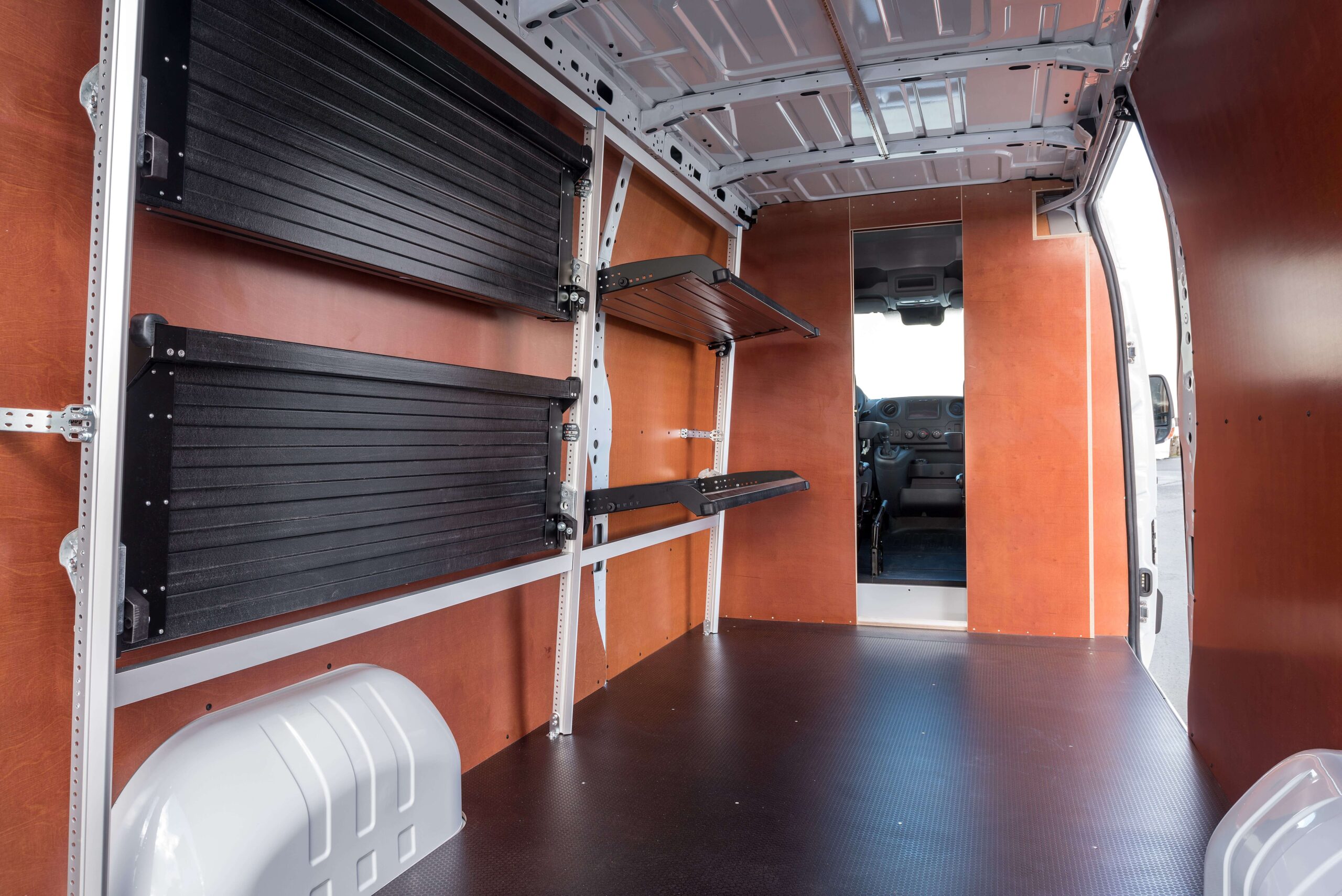 Om de laadruimte duurzaam en praktisch in te richten, is een stevige betonplex vloerplaat geplaatst. De zijwanden en deuren zijn afgewerkt met een beschermende film, wat extra stevigheid biedt en de laadruimte eenvoudig schoon te houden maakt. De bus is voorzien van een opklapbaar schappensysteem, waarmee pakketten overzichtelijk kunnen worden gesorteerd en veilig vervoerd. In de Home Delivery uitvoering zijn de schappen breder, waardoor er nog meer opbergruimte ontstaat.