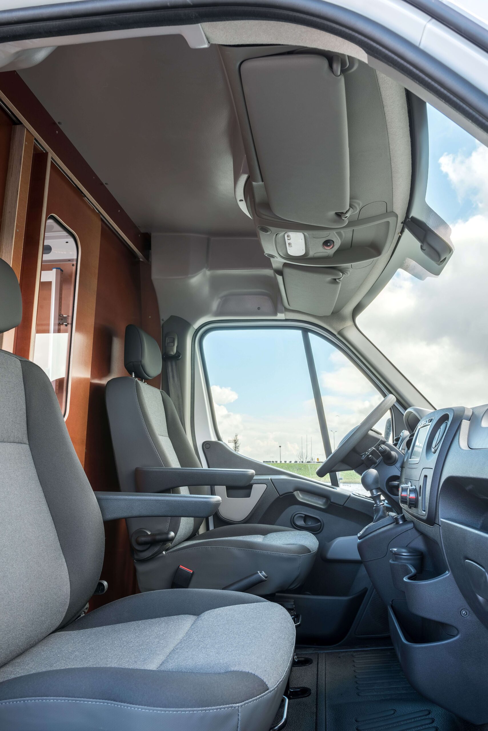Een handige toevoeging aan deze uitvoering is de tussenwand met schuifdeur en raam. Dit zorgt voor een soepele doorloop tussen de cabine en de laadruimte, waardoor chauffeurs sneller hun route kunnen vervolgen zonder de buitenzijde van het voertuig te hoeven gebruiken.