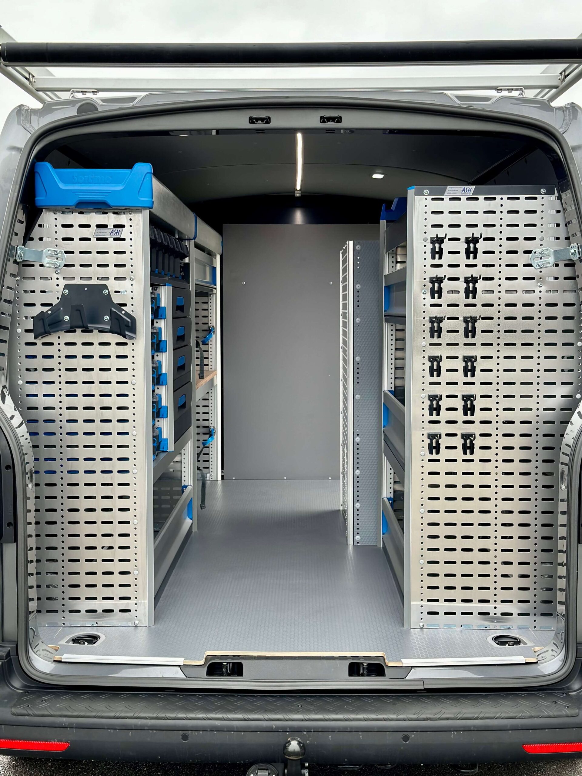 Omdat monteurs vaak werken in omgevingen met weinig licht, is de laadruimte voorzien van een Sortimo LED-verlichtingssysteem van 2000 mm, dat geschakeld is op de binnenverlichting en gevoed wordt via de voertuigaccu met een relais. Dit zorgt voor heldere verlichting in de werkruimte, waardoor werkzaamheden altijd goed zichtbaar zijn.