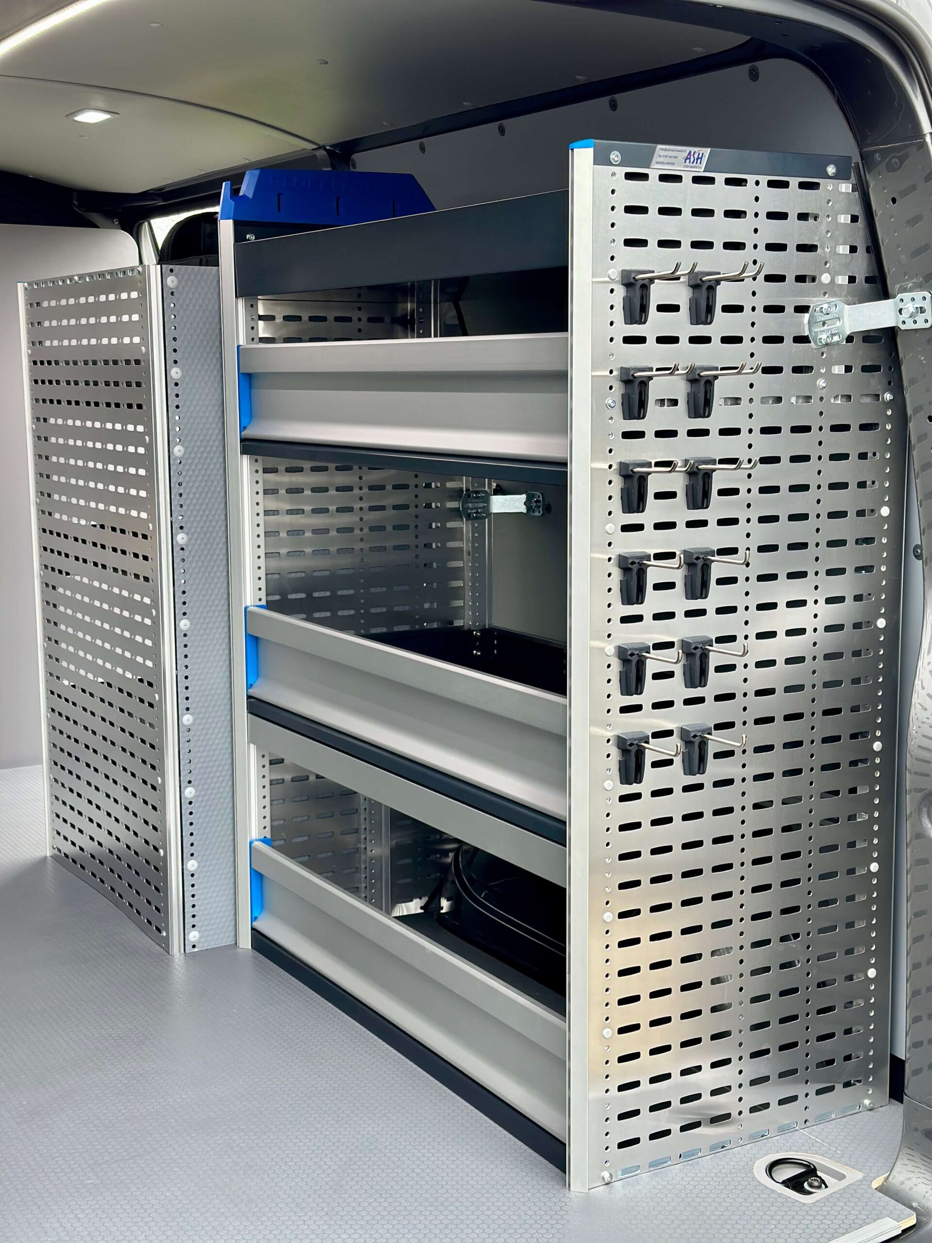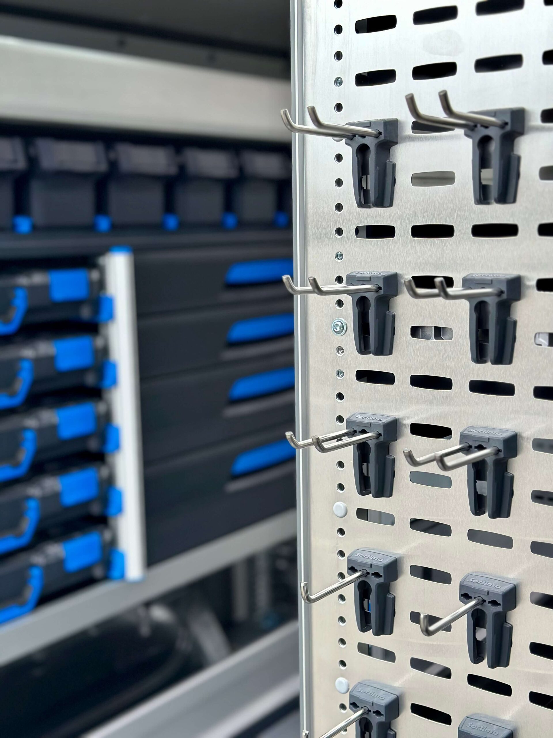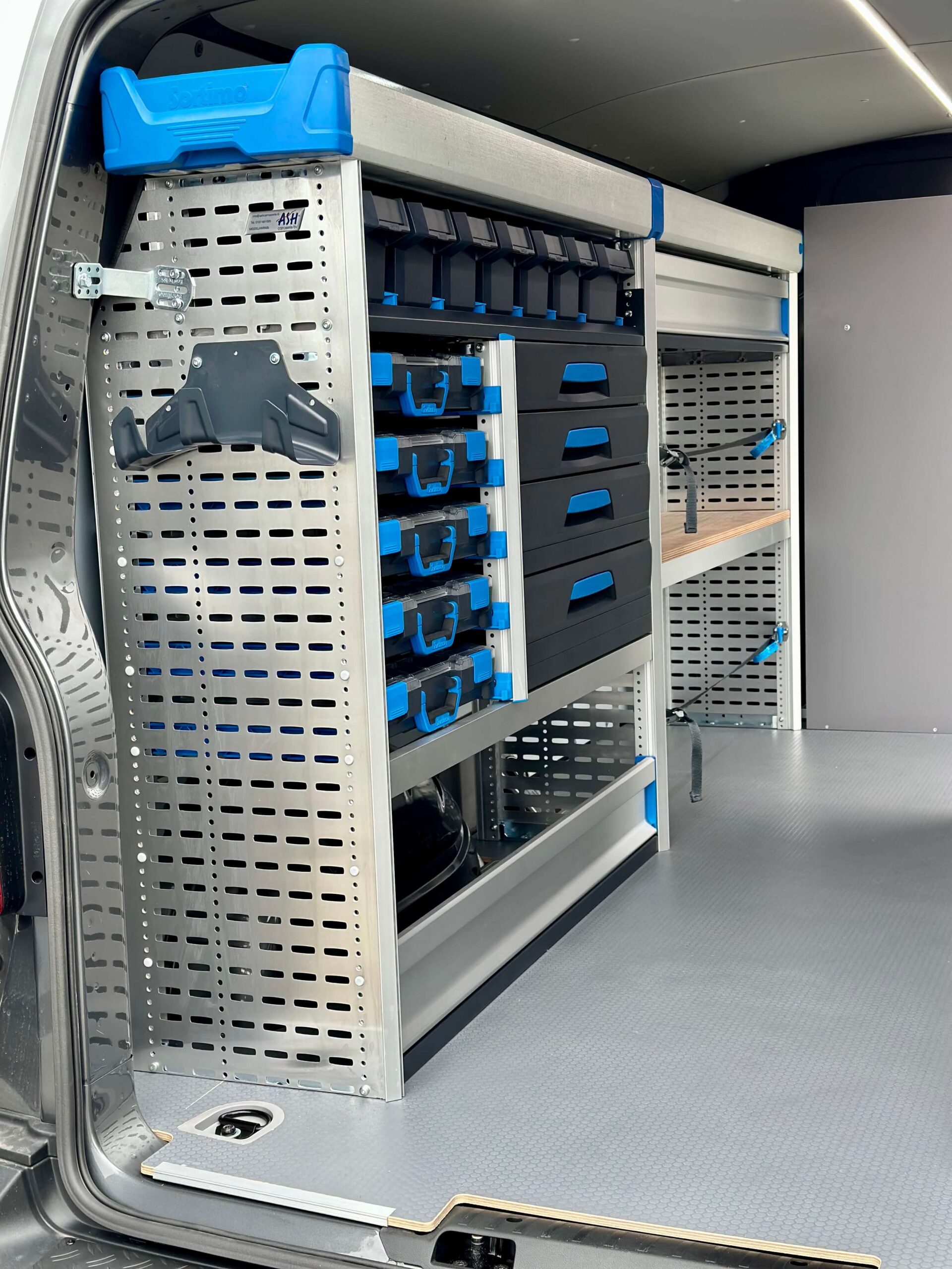Voor een overzichtelijke opbergstructuur is de laadruimte voorzien van een Sortimo-opstelling aan de linker- en rechterzijde en bij de schuifdeur. De linkerzijde biedt diverse schuiflades en opbergvakken, terwijl aan de rechterzijde een extra legboord met aluminium valklep is toegevoegd voor koffers en andere benodigdheden. De schuifdeurzijde bevat extra opbergruimte voor kleinere materialen. Hierdoor blijft de werkruimte geordend en kunnen monteurs snel bij hun gereedschappen en materialen.