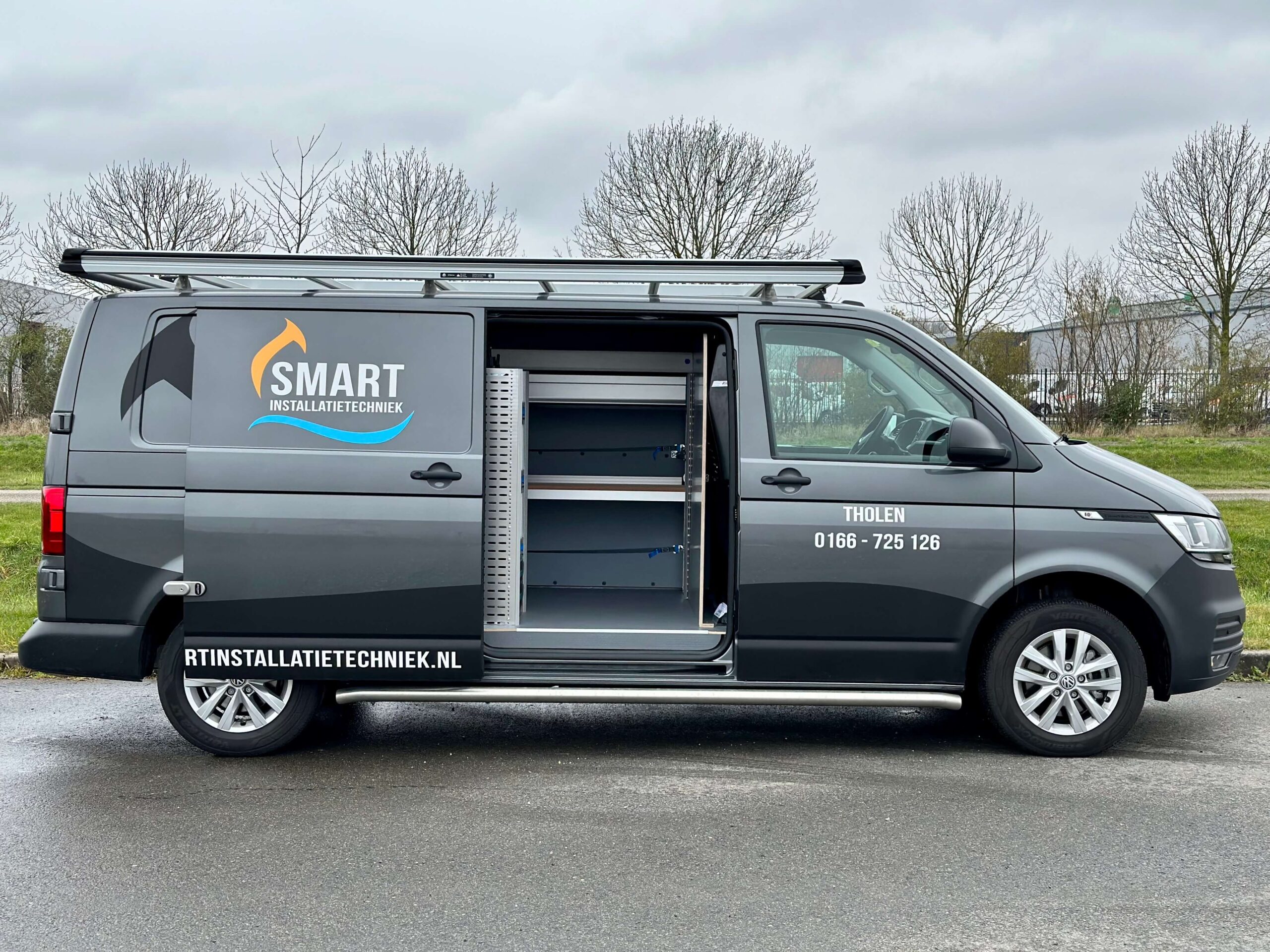 Smart Installatie, specialist in airconditioning en klimaatbeheersing, zocht een bedrijfswagen die perfect aansloot op hun werkzaamheden. De Volkswagen Transporter servicebus moest worden voorzien van een doordachte inrichting die gereedschappen en materialen overzichtelijk en veilig opbergt. Daarnaast was er behoefte aan krachtige LED-verlichting in de laadruimte en extra beveiliging tegen inbraak.
